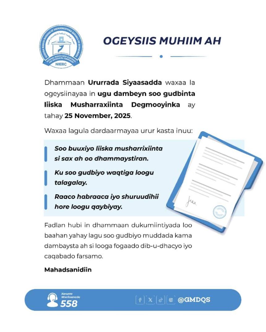 Blog Dhammaan ururrada siyaasadda waxaa la ogeysiinayaa in ugu dambayn….. Last updated: December 16, 2025 4:37 pm By introvertmustafaByintrovertmustafa Share 0 Min Read SHARE soo gudbinta liiska murashaxiinta degmooyinka ay ku egyahay 25,November 2025. Share This Article Email Copy Link Print Previous Article Maalinta Sabtida….. Next Article Guddiga Madaxa Bannaan ee Doorashooyinka Qaranka iyo….. Leave a Comment Leave a Reply Cancel replyYour email address will not be published. Required fields are marked *Comment * Name * Email * Website Save my name, email, and website in this browser for the next time I comment. FacebookLikeXFollowYoutubeSubscribeTiktokFollow Most Read Muwaadin Nala Wadaag Fikir Kaaga Warsaxaafadeed ka soo baxay Guddiga Madaxa-bannaan ee Doorashooyinka Qaranka iyo Soohdimaha. OGAYSIIS Guddiga Madaxa-Bannaan ee Doorashooyinka Qaranka iyo…. Guddiga Madaxa-Bannaan ee Doorashooyinka Qaranka iyo…. Commissioner Cabdullahi Salaad Yarow oo ka hadlay daah-furka…. Dhammaan goobaha diiwaangelinta codbixiyeyaasha ee magaalada…. IMPORTANT ANNOUNCEMENT Diiwaangelinta codbixiyeyaasha ayaa ka socota Dhammaan goobaha….. KURAASTA UU HELAY URUR SIYAASADEEDKA TOWFIIQ
