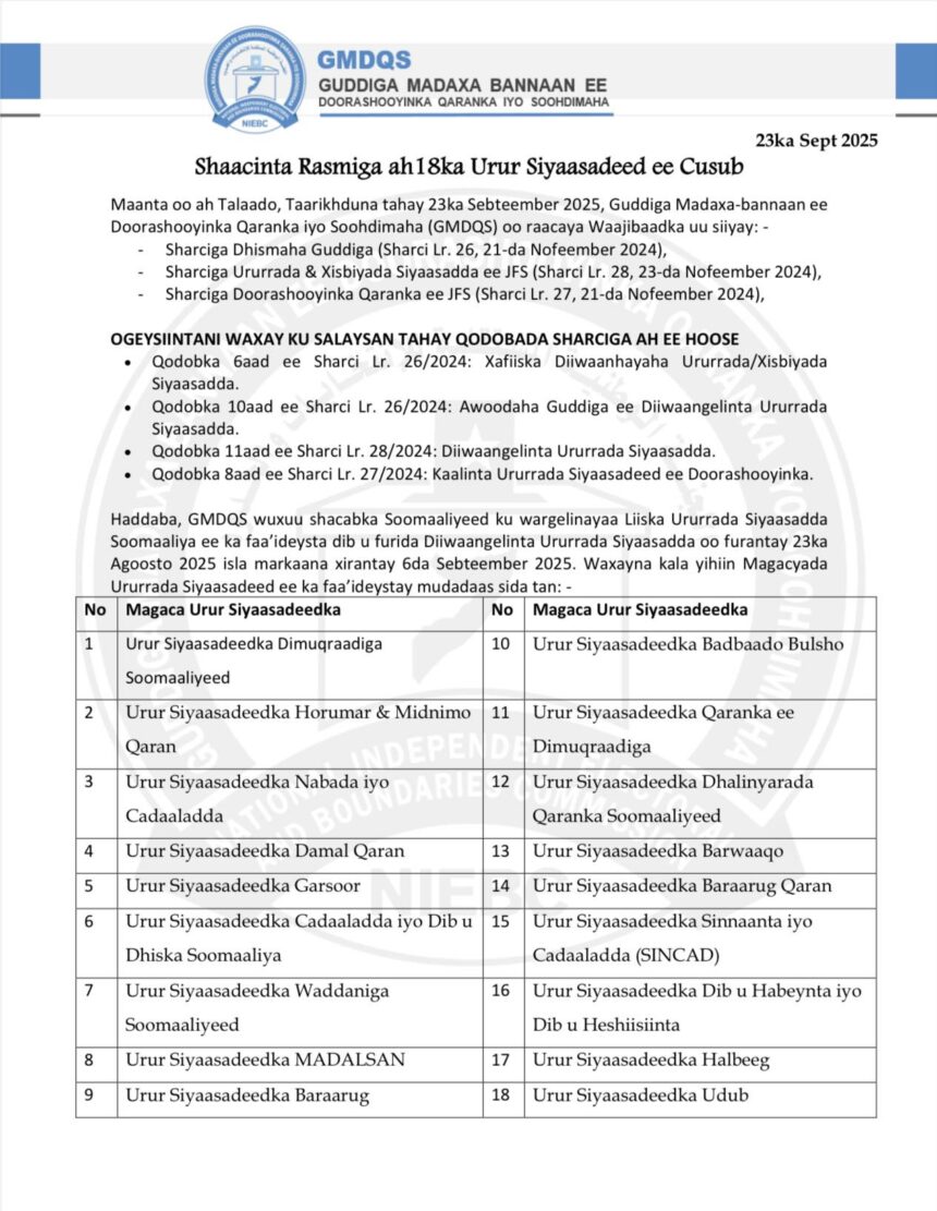 Soohdimaha (GMDQS) waxa uu Maanta oo ay Taarikhdu tahay 23, 9,2025, si rasmi ah u shaacinayaa liiska 18-ka Urur Siyaasadeed ee Cusub, kuwaas oo ku soo biiray Urur Siyaasadeedyada Dalka, kaddib markii ay soo buuxiyeen shuruudaha diiwaangelinta.