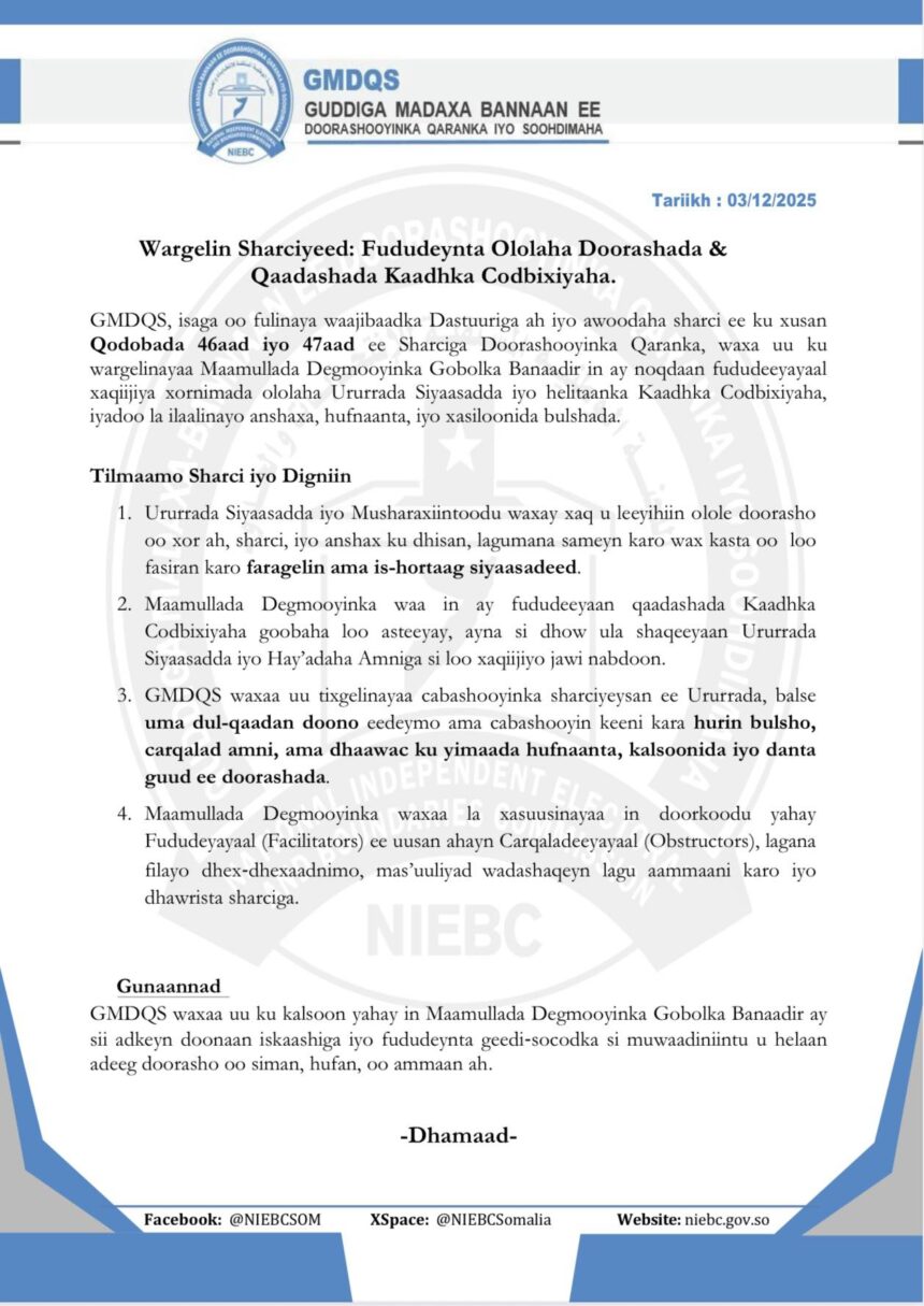 GMDQS, isaga oo fulinaya waajibaadka Dastuuriga ah iyo awoodaha sharci ee ku xusan Qodobada 46aad iyo 47aad ee Sharciga Doorashooyinka Qaranka, waxa uu ku wargelinayaa Maamullada Degmooyinka Gobolka Banaadir in ay noqdaan fududeeyayaal xaqiijiya xornimada ololaha Ururrada Siyaasadda iyo helitaanka Kaadhka Codbixiyaha, iyadoo la ilaalinayo anshaxa, hufnaanta, iyo xasiloonida bulshada.