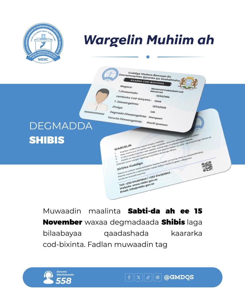 Blog Maalinta Sabtida, 15-ka Nofeembar 2025, ayaa degmada Shibis laga….. Last updated: December 16, 2025 4:31 pm By introvertmustafaByintrovertmustafa Share 0 Min Read SHARE bilaabi doonaa bixinta kaararka codbixinta. Muwaadin, haddii aad iska diiwaangelisay Shibis, Sabtida kaarkaaga doono. Share This Article Email Copy Link Print Previous Article Maalinta Sabtida, 15-ka Nofeembar 2025, ayaa degmada Shangaani…. Next Article Maalinta Sabtida….. Leave a Comment Leave a Reply Cancel replyYour email address will not be published. Required fields are marked *Comment * Name * Email * Website Save my name, email, and website in this browser for the next time I comment. FacebookLikeXFollowYoutubeSubscribeTiktokFollow Most Read Muwaadin Nala Wadaag Fikir Kaaga Warsaxaafadeed ka soo baxay Guddiga Madaxa-bannaan ee Doorashooyinka Qaranka iyo Soohdimaha. OGAYSIIS Guddiga Madaxa-Bannaan ee Doorashooyinka Qaranka iyo…. Guddiga Madaxa-Bannaan ee Doorashooyinka Qaranka iyo…. Commissioner Cabdullahi Salaad Yarow oo ka hadlay daah-furka…. Dhammaan goobaha diiwaangelinta codbixiyeyaasha ee magaalada…. IMPORTANT ANNOUNCEMENT Diiwaangelinta codbixiyeyaasha ayaa ka socota Dhammaan goobaha….. KURAASTA UU HELAY URUR SIYAASADEEDKA TOWFIIQ