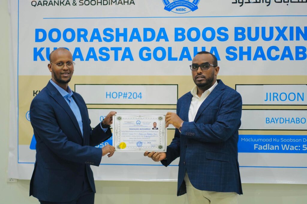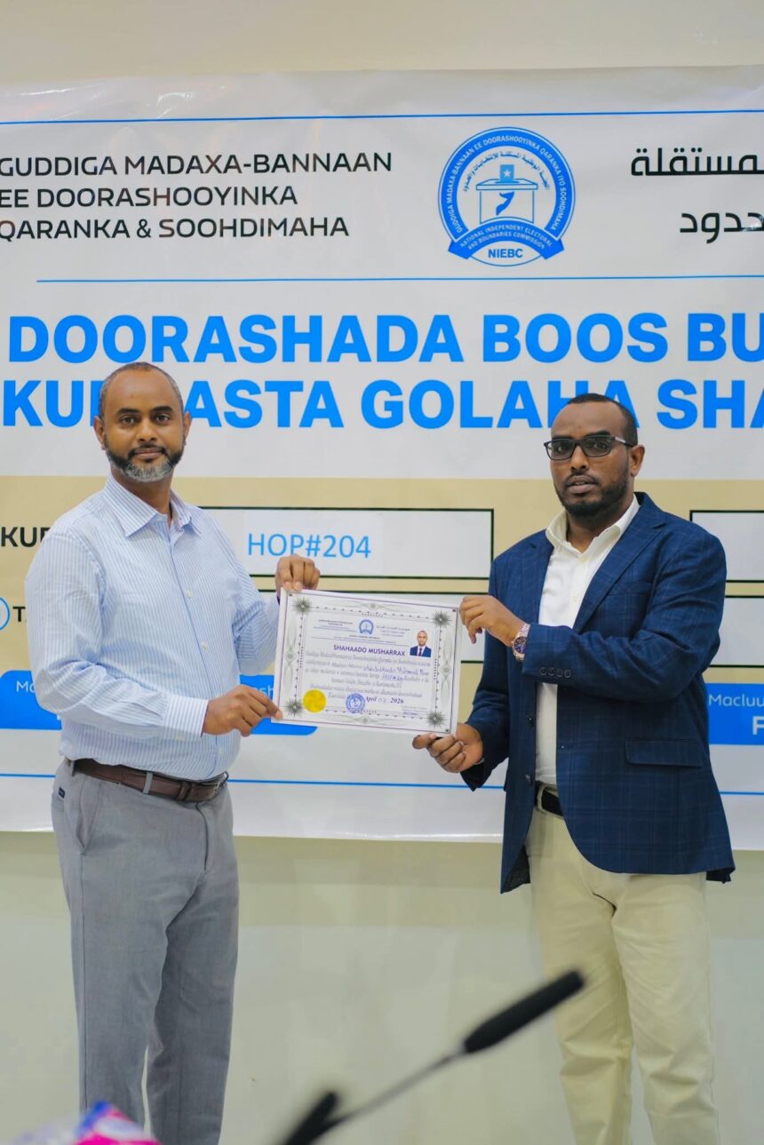 Guddiga Madaxa Bannaan ee Doorashooyinka iyo Soohdimaha ayaa maanta si rasmi ah shahaadada musharaxnimada u guddoonsiiyey musharaxiinta u tartamaya kursiga tirsigiisu yahay HOP#204, kaas oo ka mid ah kuraasta ka bannaanaatay Golaha Shacabka ee Baarlamaanka Federaalka Soomaaliya.