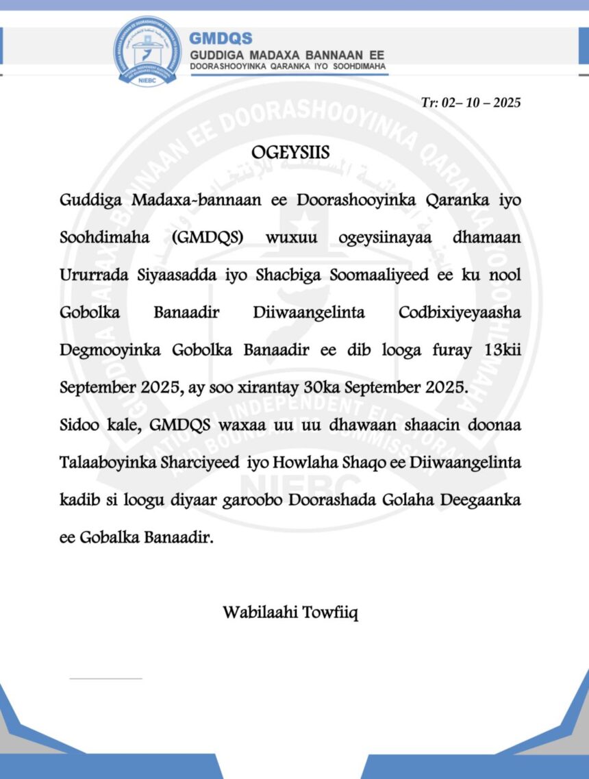 ogeysiinayaa dhamaan Ururrada Siyaasadda iyo Shacbiga Soomaaliyeed ee ku nool Gobolka Banaadir Diiwaangelinta Codbixiyeyaasha Degmooyinka Gobolka Banaadir ee dib looga furay 13-kii September 2025, in ay soo xirantay 30-ka September 2025.