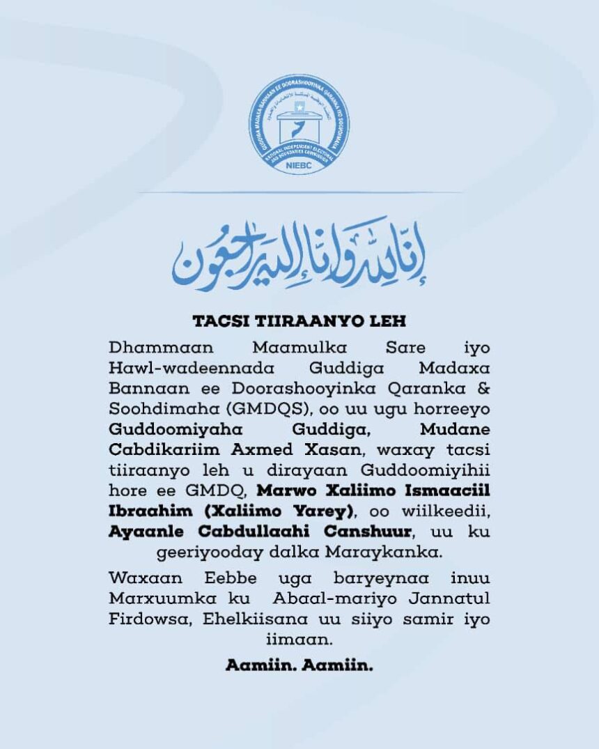 Dhammaan Maamulka sare iyo Hawlwadeennada Guddiga Madaxa Bannaan ee Doorashooyinka Qaranka & Soohdimaha (GMDQS) oo ugu horeeyo Gudoomiyaha Guddiga Mudane Abdikarim Ahmed Hassan waxay tacsi tiiraanyo leh u dirayaan Guddoomiyihii hore ee GMDQ, Marwo Xaliimo Ismaaciil Ibraahim (Xaliimo Yarey), oo uu wiilkeedii Ayaanle Cabdullaahi Canshuur ku geeriyooday dalka Maraykanka.