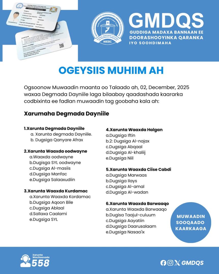 Blog Today Tuesday 02, December 2025…. Last updated: December 17, 2025 3:24 pm By introvertmustafaByintrovertmustafa Share 0 Min Read SHARE the district of Dayniile has started issuing voters cards. Citizens, if you have registered in Daynile district, please find your card, so that you can cast your vote on the day of election. Share This Article Email Copy Link Print Previous Article In Galkacyo city of Galmudug regional state there is a process of registration of voters… Next Article The Independent National Electoral Committee has launched…. Leave a Comment Leave a Reply Cancel replyYour email address will not be published. Required fields are marked *Comment * Name * Email * Website Save my name, email, and website in this browser for the next time I comment. FacebookLikeXFollowYoutubeSubscribeTiktokFollow Most Read Muwaadin Nala Wadaag Fikir Kaaga Warsaxaafadeed ka soo baxay Guddiga Madaxa-bannaan ee Doorashooyinka Qaranka iyo Soohdimaha. OGAYSIIS Guddiga Madaxa-Bannaan ee Doorashooyinka Qaranka iyo…. Guddiga Madaxa-Bannaan ee Doorashooyinka Qaranka iyo…. Commissioner Cabdullahi Salaad Yarow oo ka hadlay daah-furka…. Dhammaan goobaha diiwaangelinta codbixiyeyaasha ee magaalada…. IMPORTANT ANNOUNCEMENT Diiwaangelinta codbixiyeyaasha ayaa ka socota Dhammaan goobaha….. KURAASTA UU HELAY URUR SIYAASADEEDKA TOWFIIQ
