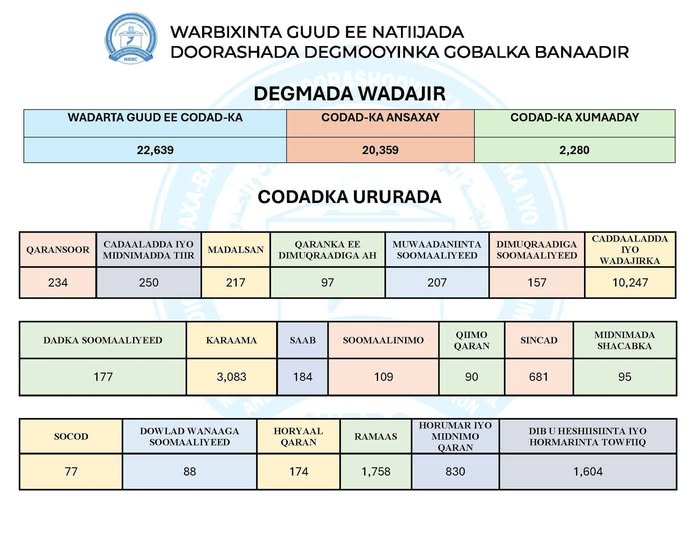 Degmada Wadajir ayaa si rasmi ah u soo gabagabeysay doorashadii Golaha Deegaanka ee Gobolka Banaadir. Wadarta guud ee codadka la dhiibtay waxay ahayd 22,639, kuwaas oo 20,359 ka mid ah ay noqdeen codad ansax ah, halka 2,280 cod ay noqdeen kuwo xumaaday.