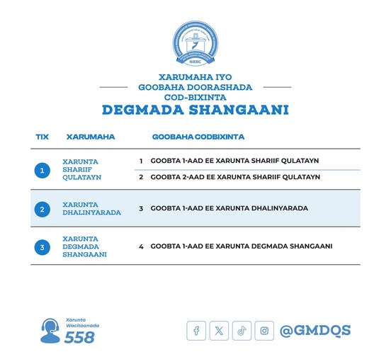 Xarumo iyo goobo cod-bixin oo si rasmi ah loo diyaariyey ayaa laga hirgeliyey Degmada Shangaani, si muwaadiniinta degmadaas ay si xor ah, hufan, nabad ah ugu gutaan waajibaadkooda codbixineed. Goobahan waxaa loo asteeyey in ay fududeeyaan helitaanka codbixinta, isla markaana ay xaqiijiyaan kala dambeyn, amni, iyo hannaanka saxda ah ee geeddi-socodka doorashada inta lagu jiro maalinta codbixinta.