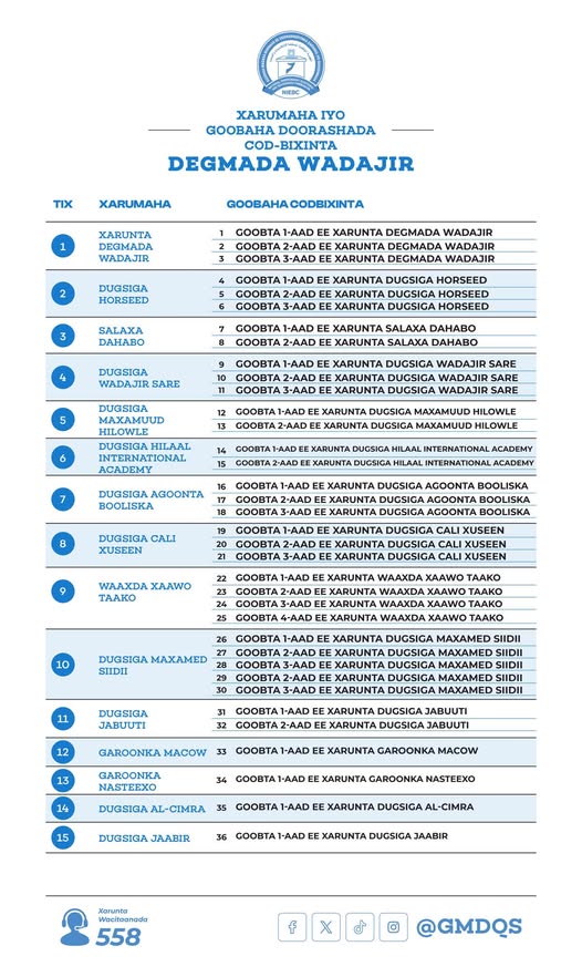 Xarumo iyo goobo cod-bixin oo si habaysan loo qorsheeyey ayaa laga sameeyey Degmada Wadajir, si ay muwaadiniintu ugu codeeyaan si xor ah, hufan, oo ammaan ah. Ujeeddada diyaarinta goobahan waa in la fududeeyo helitaanka codbixinta, lana sugo kala dambeyn, amni, iyo hab-sami u socodka geeddi-socodka doorashada inta lagu jiro maalinta codbixinta.